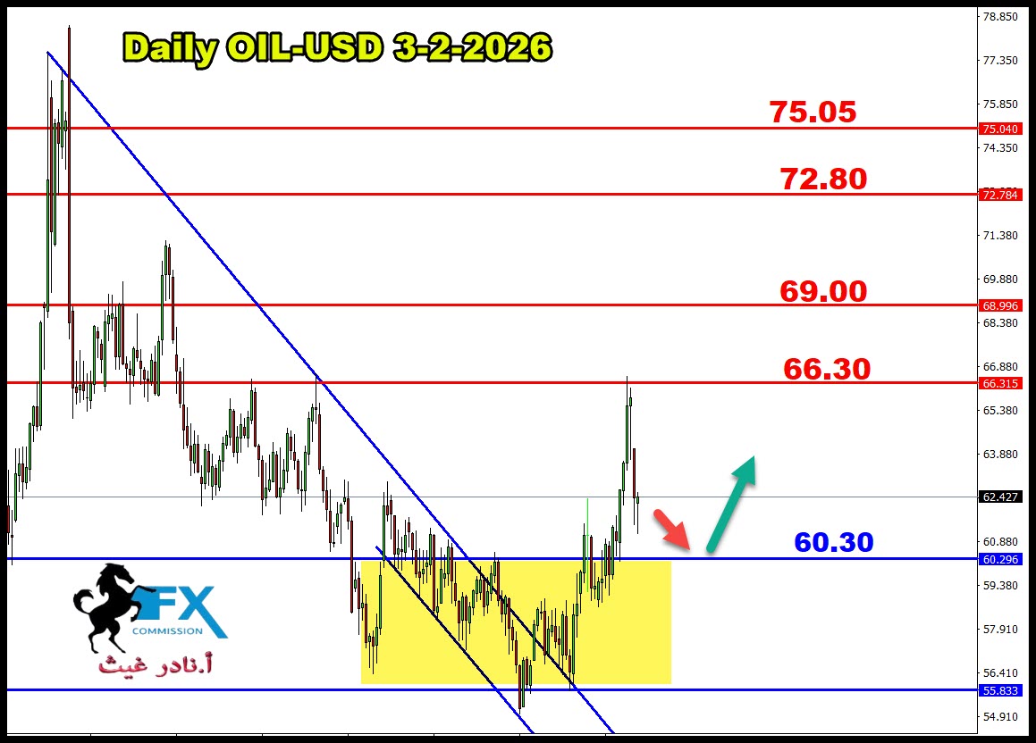3-2-2026 OIL/USD النفط افتتح على فجوة هابطة يوم امس الاثنين بعد اعلان ترمب بدء مفاوضات مع ايران وتراجع مخاوف الحرب. تقنياً على فريم اليومي نعتقد انه قد يبقى اعلى مستوى 60.30 دولار كاش للبرميل ويسعى للعودة لصعود مره اخرى نحو 66.30 تقريباً. https://vb.fx-arabia.net/uploaded/1403_11770123302.jpg |