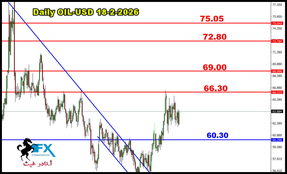 18-2-2026 OIL/USD النفط كاش فنياً نتوقع بقاء التماسك اعلى مستوى 60.30 دولار، ونتوقع استمرار زحف صاعد نحو مستوى المقاومة التالي المتواجد على سعر 66.30 دولار تقريباً. https://vb.fx-arabia.net/uploaded/1403_11771421560.jpg |