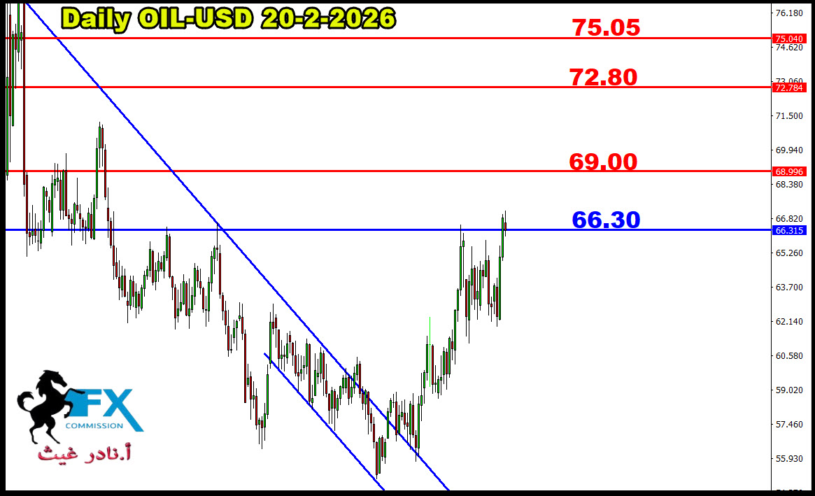 20-2-2026 OIL/USD النفط فنياً كما اشرنا امس الخميس نجح بإختراق اعلى مستوى 66.30 دولار واغلق اعلاه على فريم اليومي. لذلك نتوقع استمرار الصعود نحو المستوى التالي 69.00 دولار للبرميل كاش، كذلك تلقى النفط الدعم بعد تهديدات ترامب لإيران بأن لديها 15 يوم. https://vb.fx-arabia.net/uploaded/1403_11771590621.jpg |