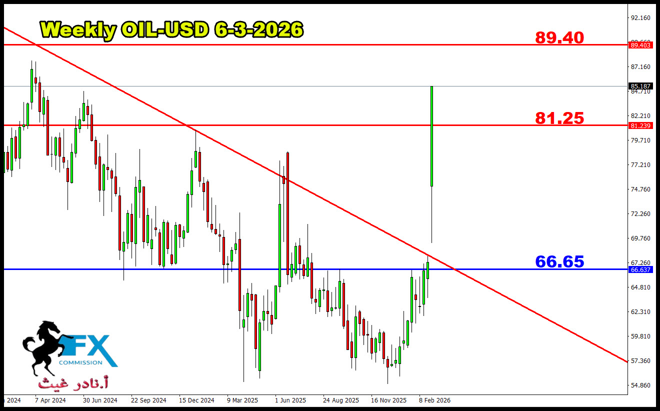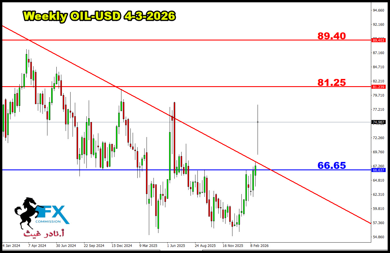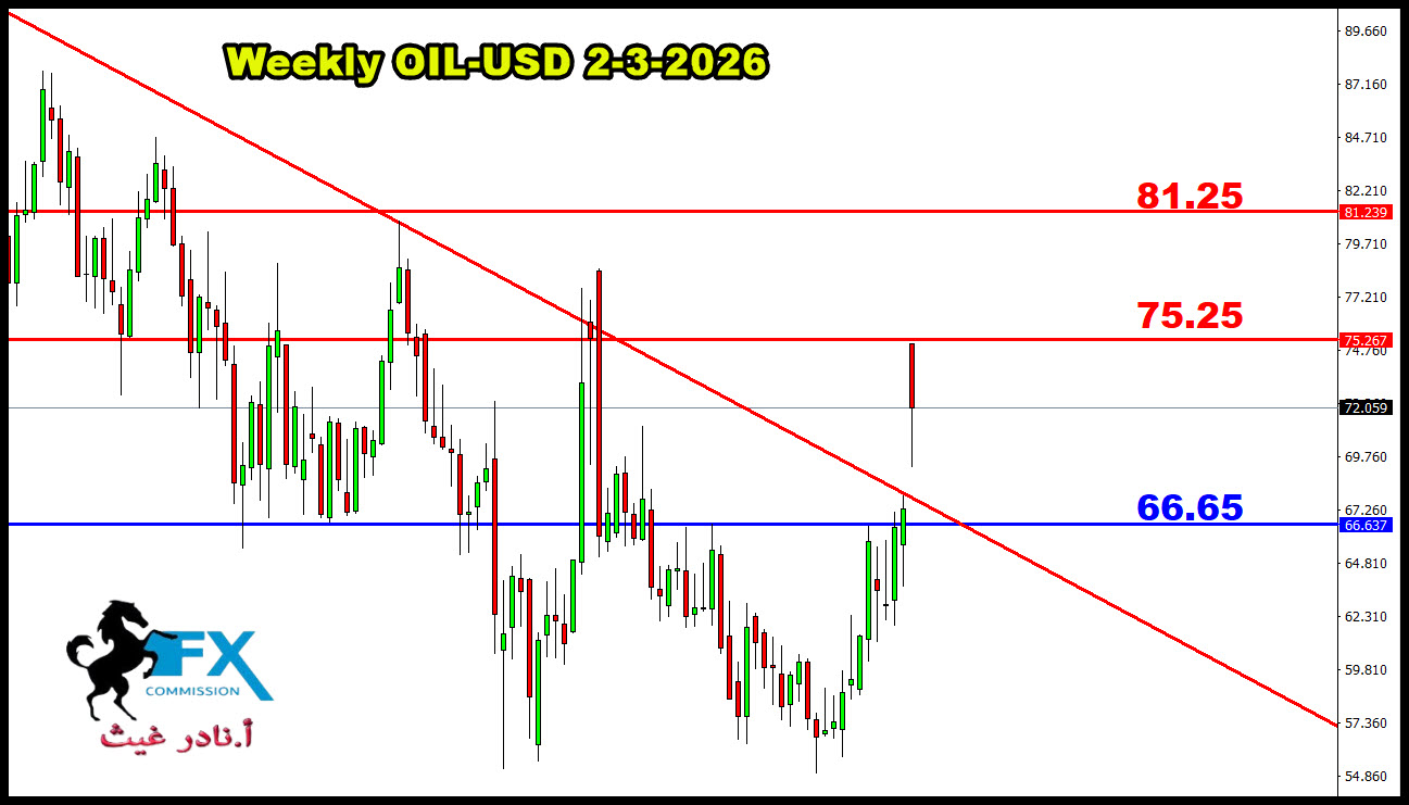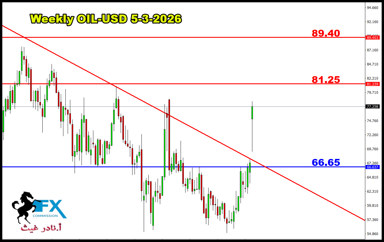 5-3-2026 OIL/USD النفط يتلقى الدعم ولا زال لا يستطيع التراجع حتى الان في ظل استمرار اغلاق مضيق هرمز وتصاعد الحرب بالشرق الأوسط، لذلك تقنياً على فريم الويكلي لا زال مرجح لصعود اعلى نحو 81 دولار للبرميل كاش، وحتى مستويات 89 دولار غير مستبعد للأيام المقبلة اذا استمرت الحرب ولم يحدث اي وقف لاطلاق النار او هدنه ولا مؤقتة. https://vb.fx-arabia.net/uploaded/1403_11772714198.jpg |