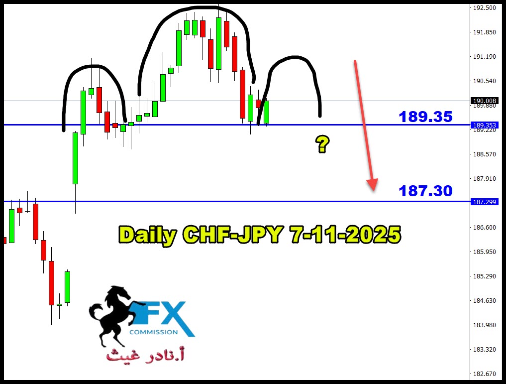 زوج فرنك ين لا زال مرجح لهبوط اعمق بكثير في ظل ضعف الفرنك وتهديد البنك المركزي السويسري باللجوء الى الفائدة السويسرية، تقنياً لفريم اليومي نرى تشكل النموذج الانعكاسي الرأس والكتفين، الكتف الايمن حتى الان لم يكتمل وبحاجة لفترة زمنية لعدة ايام اخرى للأسبوع القادم، حيث نعتقد انه سيتم كسر اسفل نموذج الرأس والكتفين والهبوط للفترة المقبلة نحو 187.30 تقريباً.