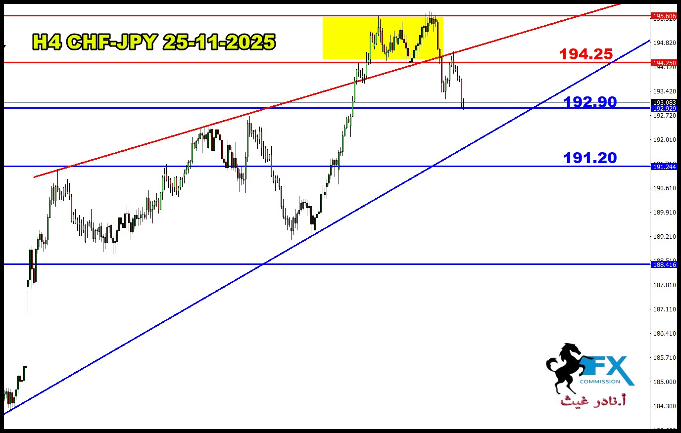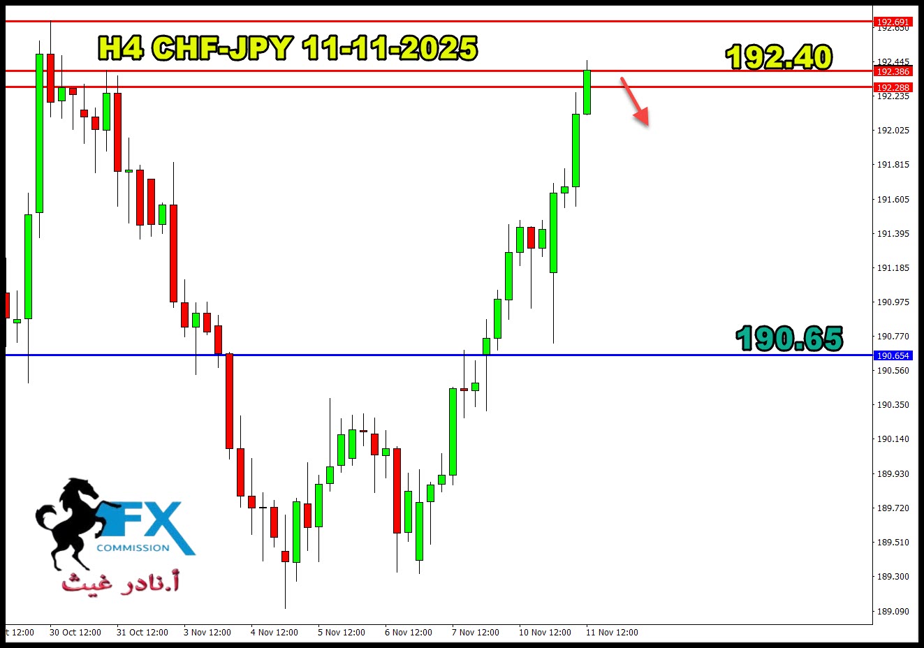 مستوى البيع على 192.40 تقريباً، نعتقد ان يشهد الزوج من هنا ارتداد الى الاسفل باذن الله.