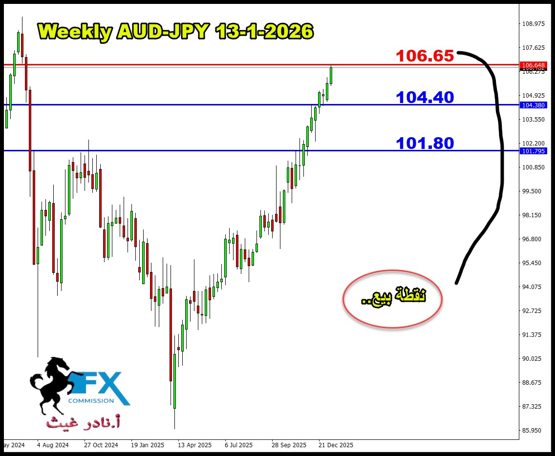 زوج استرالي ين على فريم الويكلي كنا اشرنا سابقاً ان هناك نقطة بيع متواجدة على سعر 106.65 او حولها