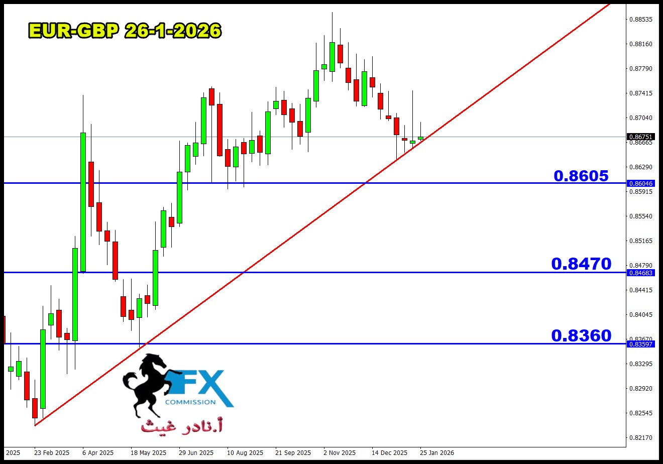 الملكي زوج يورو باوند فنياً على فريم اليومي او الويكلي لدينا خط ترند صاعد، كسر ادناه سيدفع