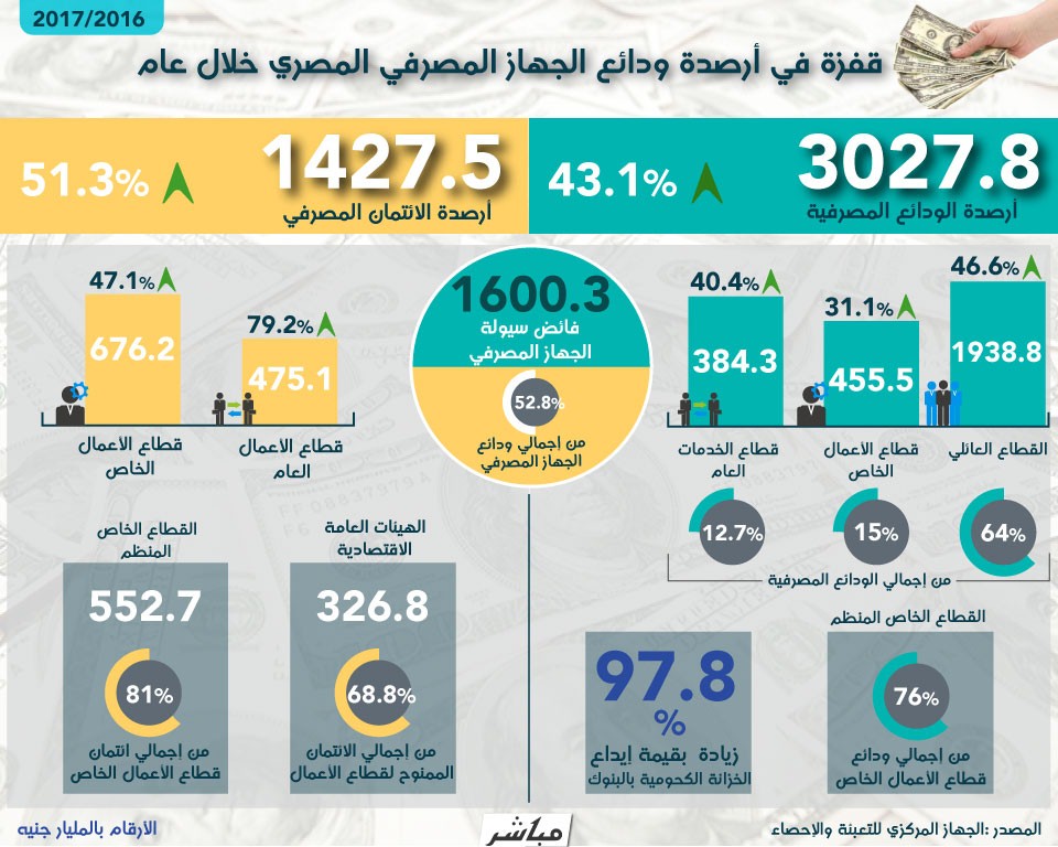 القاهرة - مباشر : ارتفعت أرصدة الودائع المصرفية بالبنك المركزي المصري خلال العام المالي 2017-2016 بنسبة 43.1%، على أساس سنوي، لتسجل مستوى 3.027 تريليون جنيه. وأظهرت بيانات الجهاز المركزي للتعبئة العامة والإحصاء، أن أرصدة الائتمان المصرفي بالمركزي المصري خلال نفس الفترة، حققت نمواً تجاوز 51%، عند مستوى 1.427 تريليون جنيه http://data.directfn.com/mix2/Client...08889_bank.jpg |