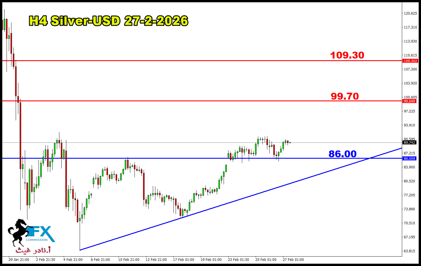 27-2-2026 Silver /USD كذلك الفضة فنياً على فريم الاربع ساعات استمرار الثبات اعلى مستوى 86.00 دولار كاش للأونصة. يبقي سيناريو الصعود قائم للاستهداف مستوى 99.70 دولار بشكل مبدئي. https://vb.fx-arabia.net/uploaded/1403_11772195780.jpg |