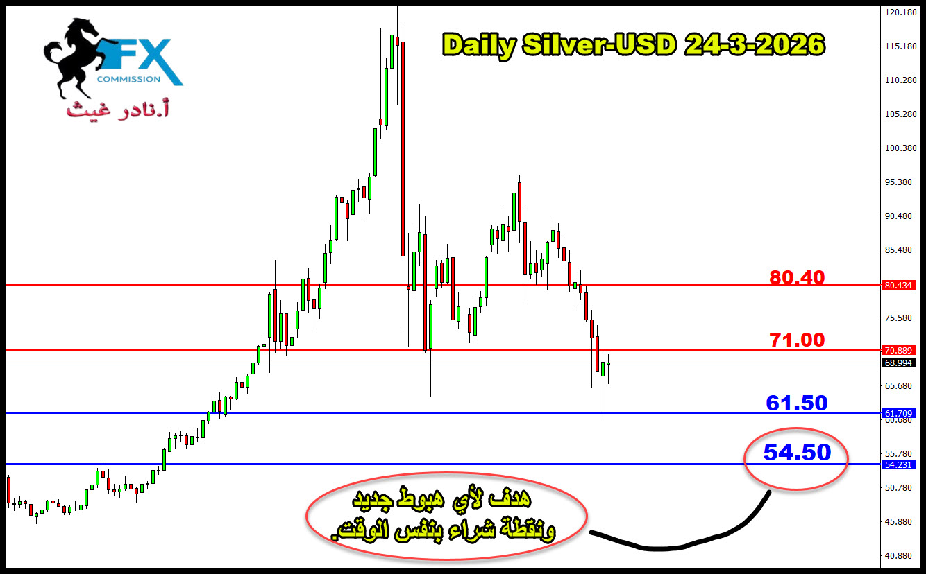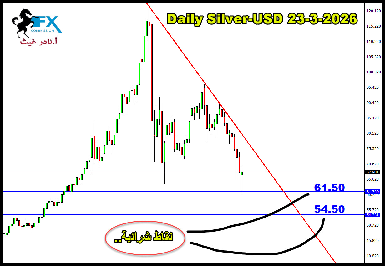 23-3-2026 Silver /USD الفضه مع اعلان ترامب وجود مفاوضات مع ايران حتى لو كانت غير صحيحة، تأثرت سلباً وهبطت الى اول مستوى شرائي على 61.50 ووصلها فعلاً وارتفع ..، لذلك اذا عاد وهبط لها تعتبر منتهية، تبقى نقطة شراء واحدة على 54.50 بحالة الهبوط لها واستهدافها او بقربها. https://vb.fx-arabia.net/uploaded/1403_11774274087.jpg |