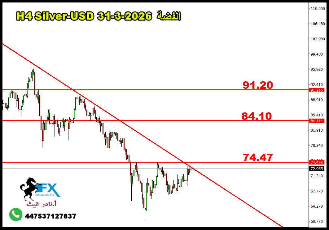 31-3-2026 Silver /USD الفضة فنياً على فريم الاربع ساعات، الان الارتفاع يستهدف خط ترند هابط لا زال ادناه. نتوقع بحالة اختراقه للاعلى سنذهب لصعود اعلى مستوى 74.47 دولار بشكل اولي. ثم الزحف نحو مستوى المقاومة التالي على 79 دولار وصولاً الى 84 دولار. كل ذلك مشروط باختراق اعلى الترند الهابط. https://vb.fx-arabia.net/uploaded/1403_11774962972.jpg |