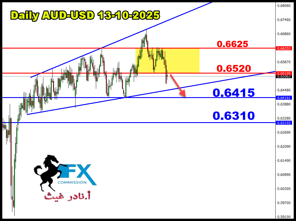 زوج استرالي دولار تقنياً لفريم اليومي لدينا نموذجين، الاول مستطيل تم كسره للأسفل 0.6520 حيث البقاء ادنى