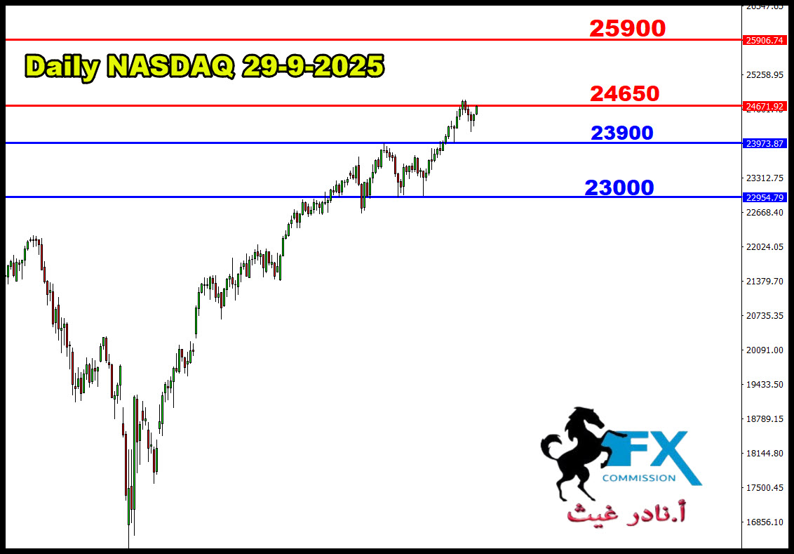 مؤشر ناسداك لفريم اليومي تقنياً تمكن ايضاً من اختراق اعلى مستوى 23800 كاش واستمر بالصعود.